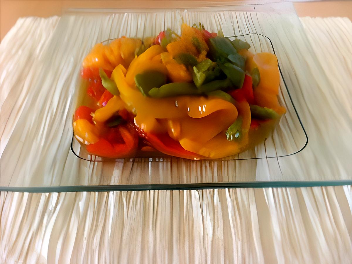 Heat olive oil in a pan. Add peppers and cook for 2 minutes. Add all other ingredients. Let them cook for ten minutes on a low flame.